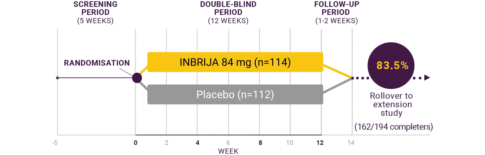 The primary endpoint of the INBRIJA pivotal study was UPDRS Part III* motor score at 30 minutes: change from predose OFF to 30 minutes post dose with INBRIJA 84 mg vs placebo.1